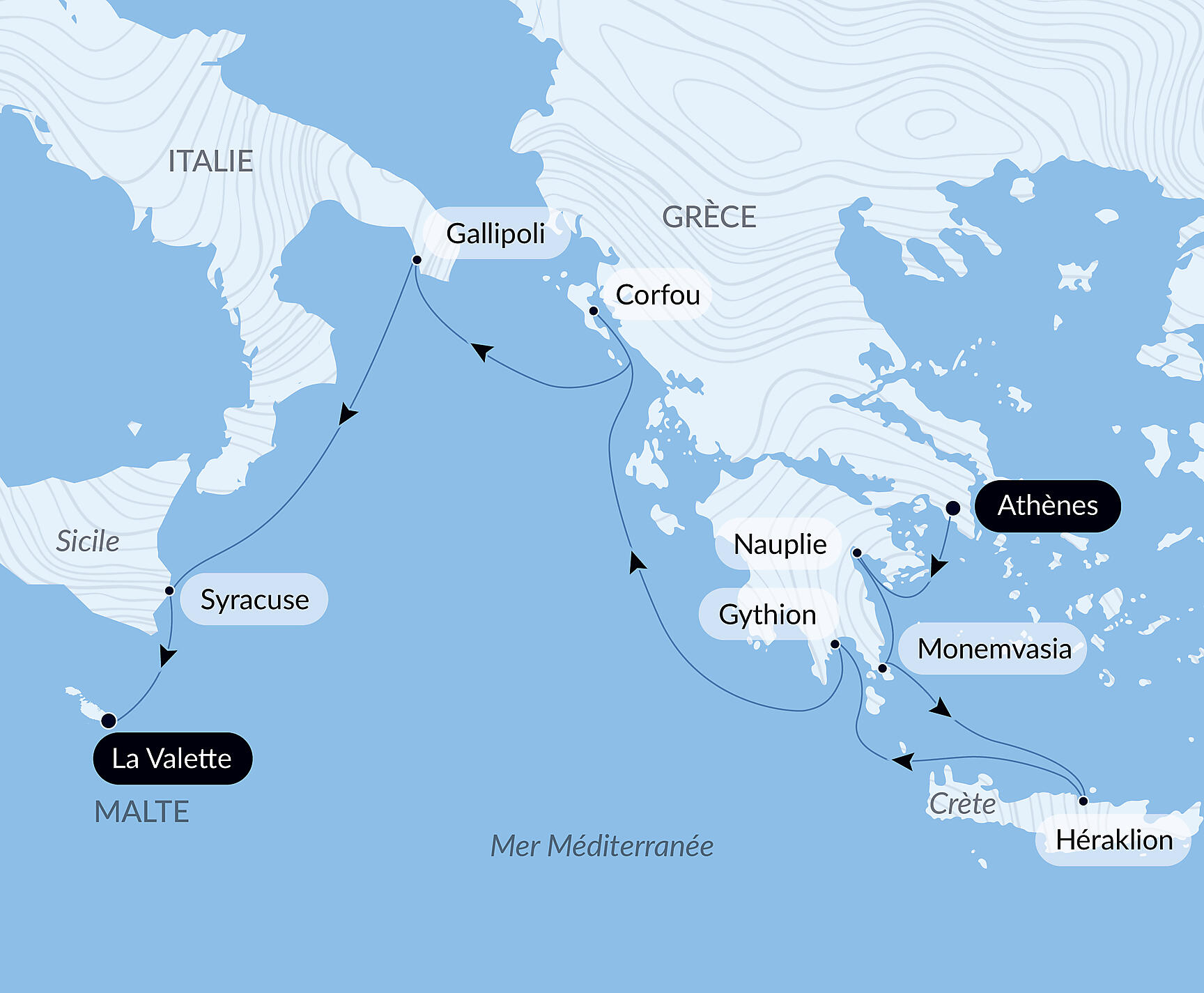 Embarquez pour une croisière à la découverte des cités antiques méditerranéennes. Du Péloponnèse à la Sicile, chaque escale dévoile un héritage grandiose : Épidaure et Mycènes, joyaux antiques classés à lUnesco, Monemvasia, cité fortifiée surgissant des flots, Héraklion, gardienne des mystères minoens, ou encore Gythion, ancien port de Sparte, vous plongent dans les mythes de la Grande Bleue. Puis, Corfou dévoile ses influences vénitiennes, prémisse à vos escales italiennes. Entre palais et parfums dagrumes, découvrez les Pouilles et Gallipoli, « la belle ville en grec », et Syracuse, labyrinthe de ruelles ponctuées déglises et de vestiges antiques, célébrant lâme sicilienne.